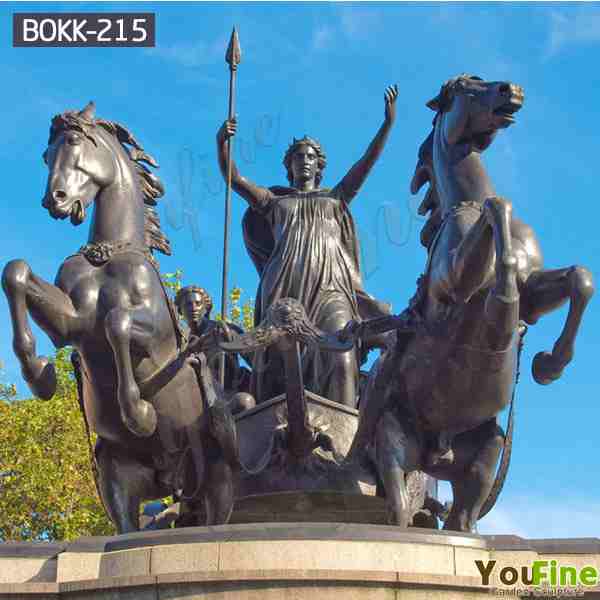 The statue depicts a flat surface that mimics the ground, with the chariot and the horses that pull it resting on it. The two horses were yoked together classically, with two soldiers sitting in the back seat. The chariot has spoke wheels and consists of a flat platform with semi-circular waist-high guards, decorated with an elegant design. The charioteer was ready to stand behind the guard, holding a Roman warrior costume and controlling the horses, which included breastplate, shoulder guard, war skirt, and even a helmet with feathers.