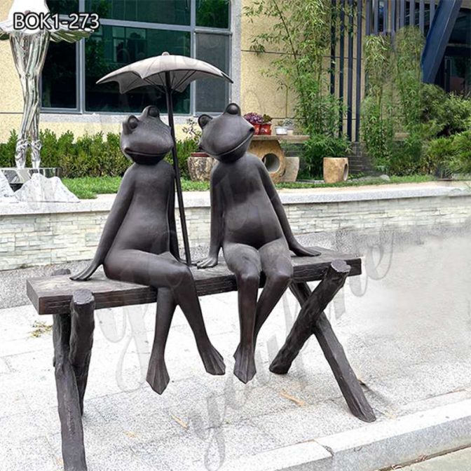 This bronze statue shows us a lovely frog. We could see the two of them sitting on a chair and holding an umbrella, like a couple. Unlike real frogs, these two brown frogs are very smooth and look cute. Such statues are very suitable whether they are placed on the street, in the garden, or in the park, and could attract people to take pictures with them.