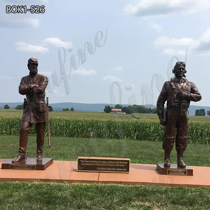 Our military memorial statues are a poignant reminder of the sacrifices made by soldiers who have served their countries. Among these treasured pieces is a custom-made bronze statue featuring two soldiers with profound commemorative significance. One soldier is depicted with a warm smile, holding a book in his right hand, while the other, an older soldier, gazes upon his comrade. This artful representation conveys a timeless message of camaraderie, valor, and the passing of knowledge from one generation of soldiers to the next.