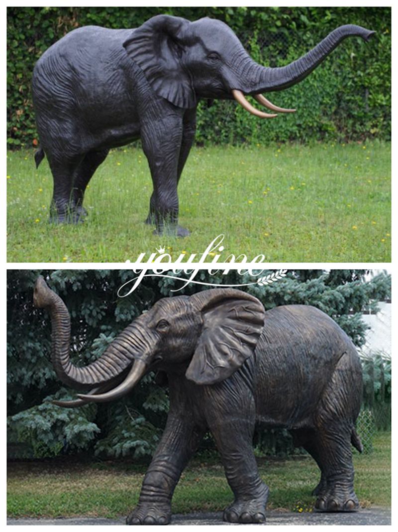 This life-size bronze elephant statue is very suitable to be placed in your garden, courtyard, or forest park. The bronze elephant blends in with the surrounding lawns and leaves. It is very harmonious and could be used as a perfect decoration, and could increase the atmosphere of wild animals.