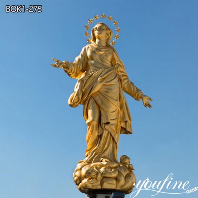 This gold Virgin Mary statue is very popular at the YouFine factory. The Virgin Mary stretched out her hands and looked forward. There are lifelike little angels on her pedestal. It seems that Our Lady, who has just appeared, is listening to people’s suffering and trying to help people. There is a halo around her head. Such a realistic bronze Virgin Mary statue is perfect for places like churches, gardens, schools, etc.