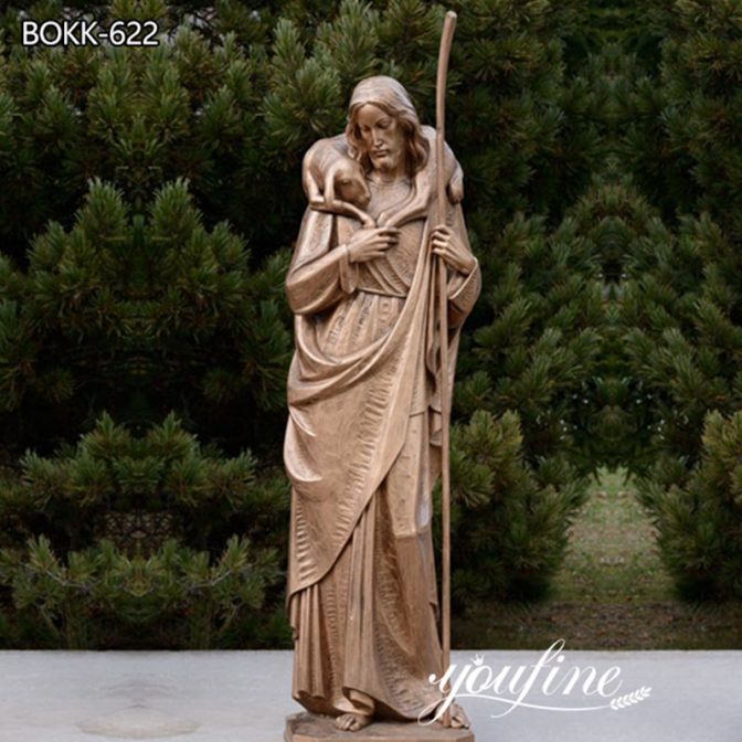 The bronze Jesus statue is very exquisite. Jesus has long flowing hair and is carrying a little lamb on his shoulder. He holds a wooden stick in one hand and the lamb’s feet in the other, and looks at the little lamb very lovingly. The lamb lay quietly, with its ears drooping, looking very docile. The folds of Jesus’ clothes and the long fingers and toes are delicate.