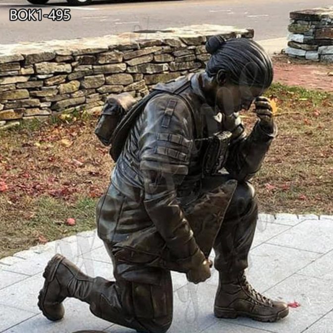 This bronze female soldier sculpture is cast from high-quality bronze by YouFine’s top artists. The female soldier was wearing a military uniform, kneeling on one leg, holding her forehead with one hand, and feeling sad.