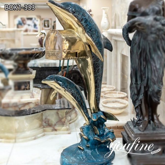 This large bronze dolphin statue has a beautiful appearance. We could see two dolphins floating on top of a spray. One of the dolphins also has a mailbox hanging in his arms, like an apostle who collects letters for the owner of the house. The artisans of the YouFine factory use high-quality bronze materials to make bronze animal statues, so the statues could have a long service life.